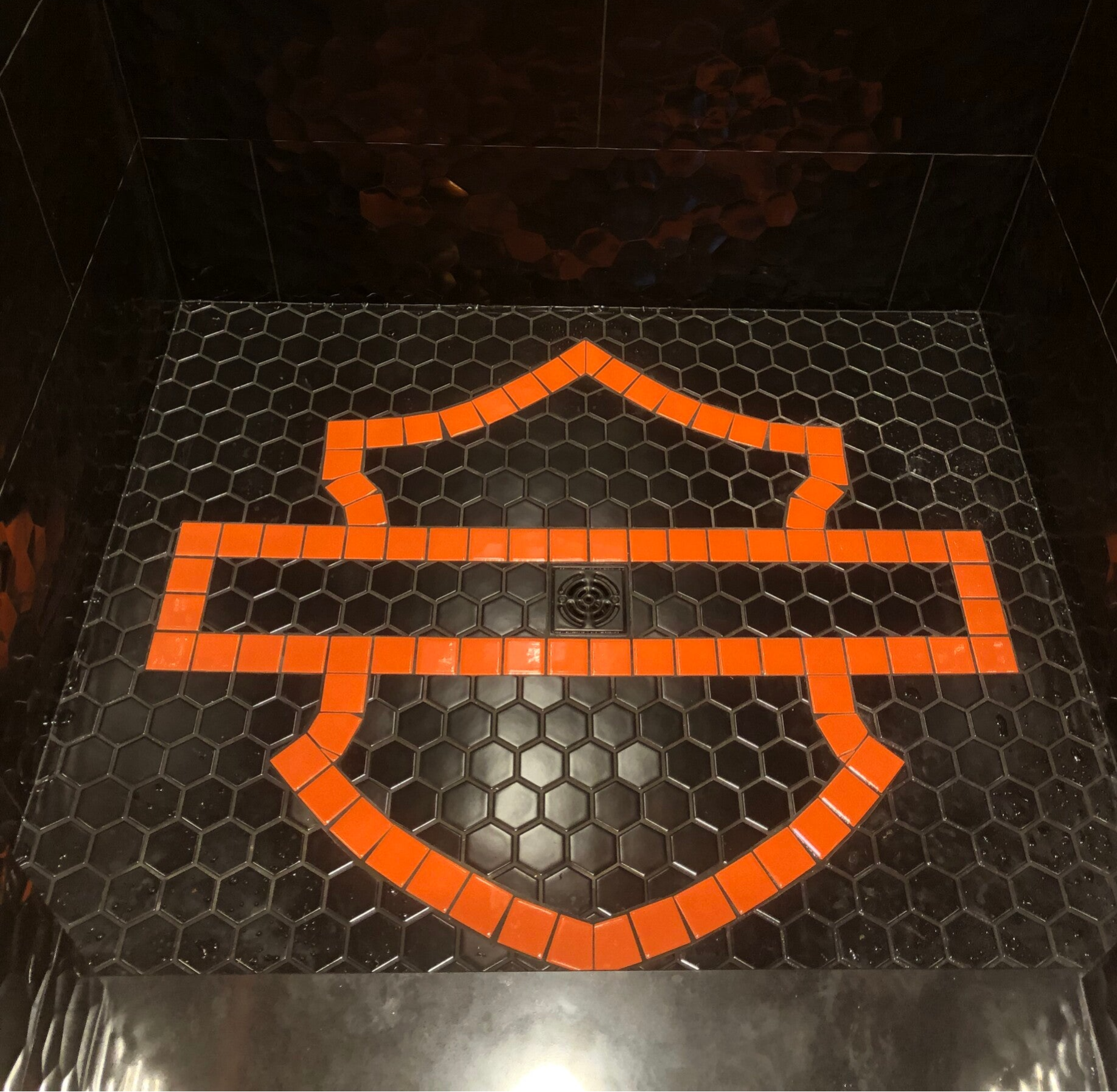 This client asked for a custom Harley Davidson Tile work design in his shower and entire bathroom. We worked together to find a design that was both practical and eye catching!